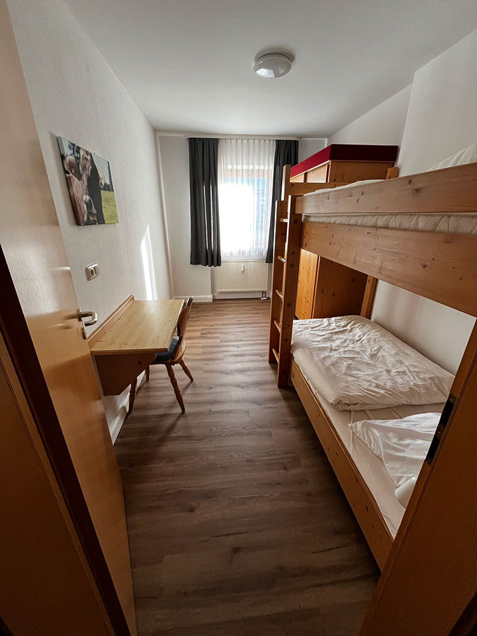 Das Schlafzimmer ist mit einem Doppelbett ausgestattet. Im Kinderzimmer befindet sich ein Etagenbett. Das Badezimmer verfügt über eine Dusche. Separates WC.